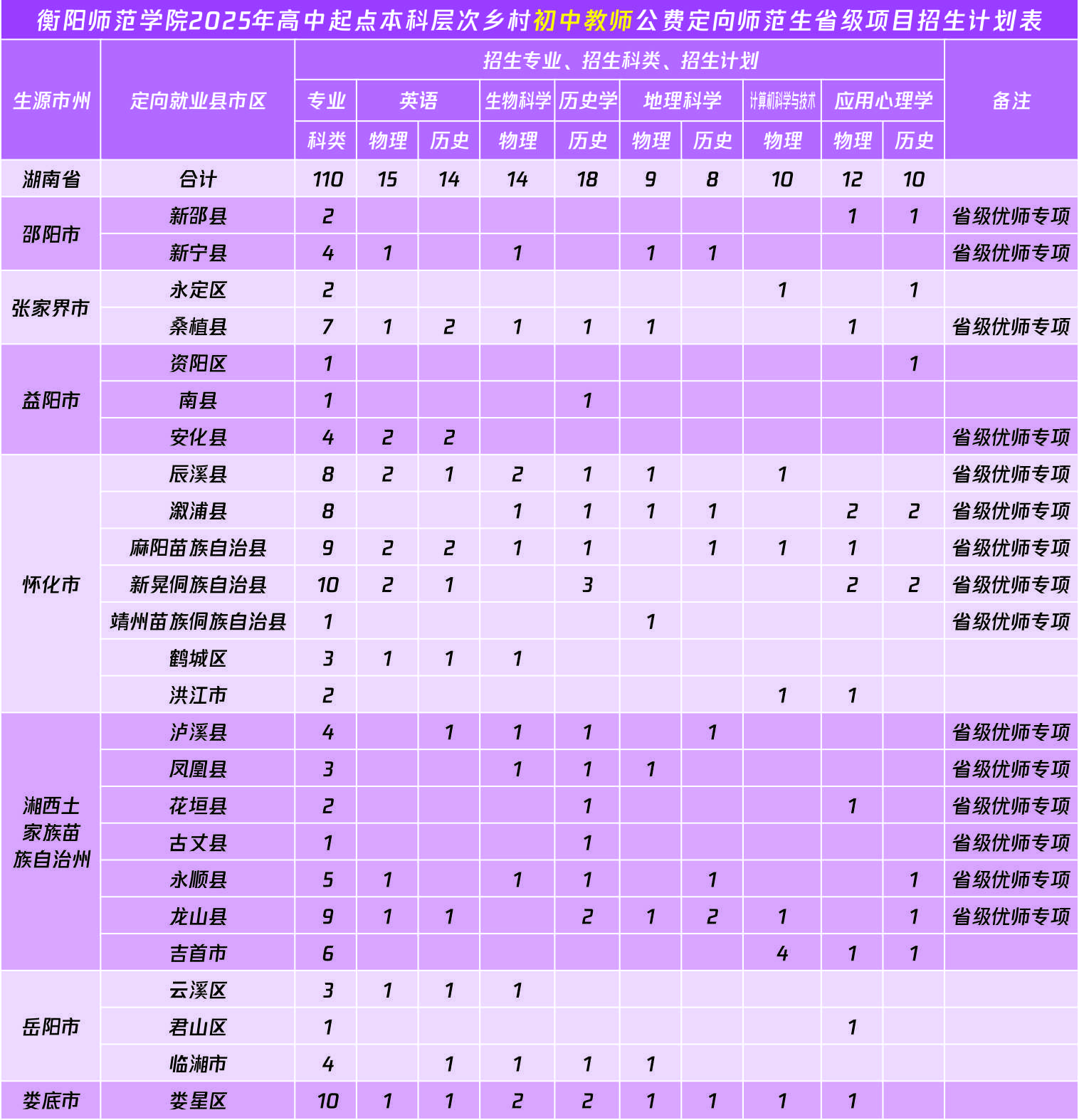 英语、生物科学、历史学、地理科学、计算机科学与技术、应用心理学6个专业面向省内7个市州招收110人。其中,省级优师专项77人。