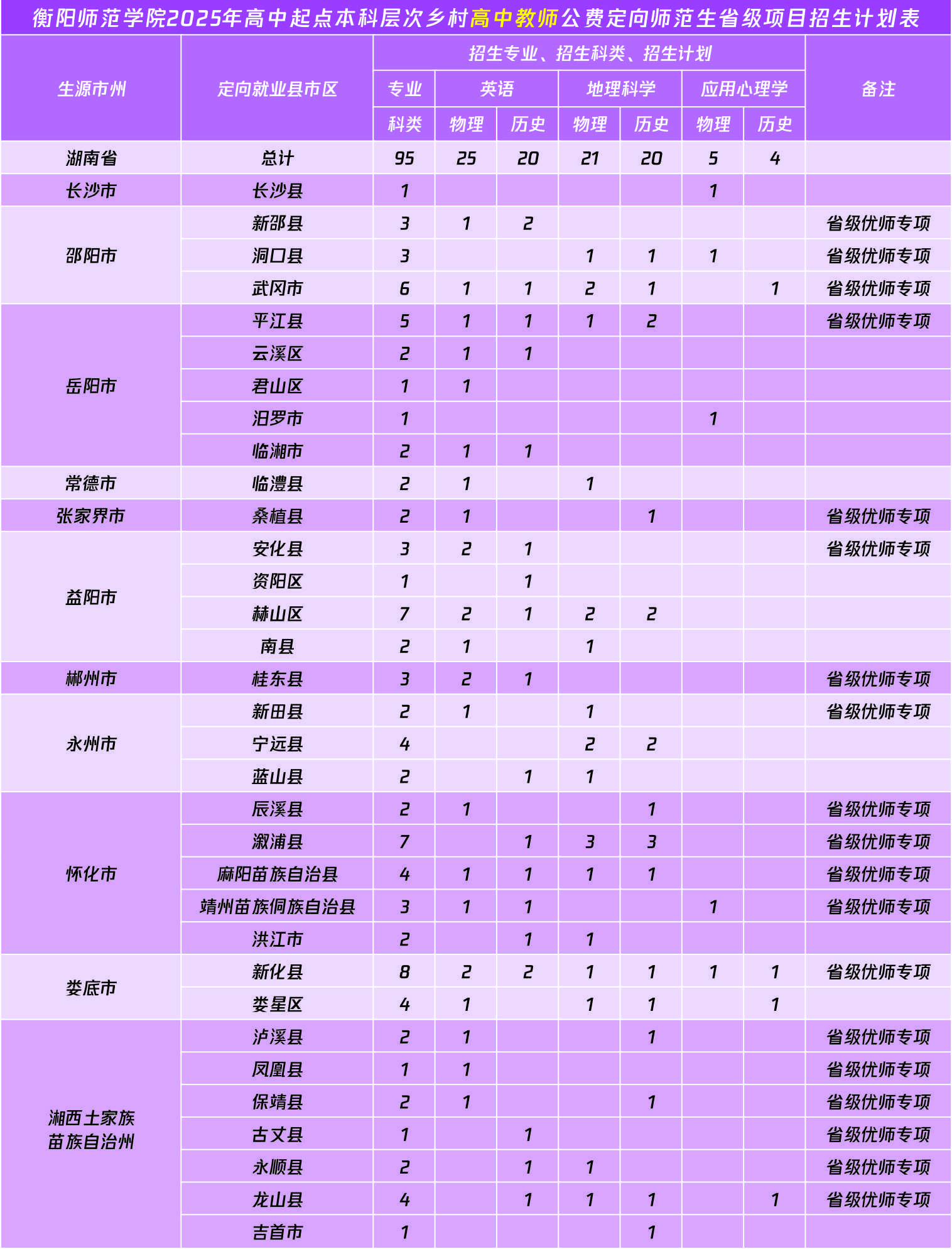英语、地理科学、应用心理学3个专业面向省内11个市州招收95人。其中,省级优师专项63人。