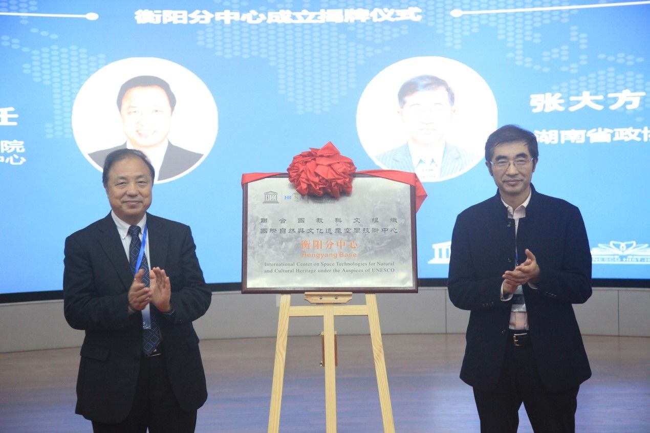 中国科学院空天信息研究院郭华东院士与湖南省政协时任副主席张大方教授共同为落户我院的HIST衡阳分中心揭牌